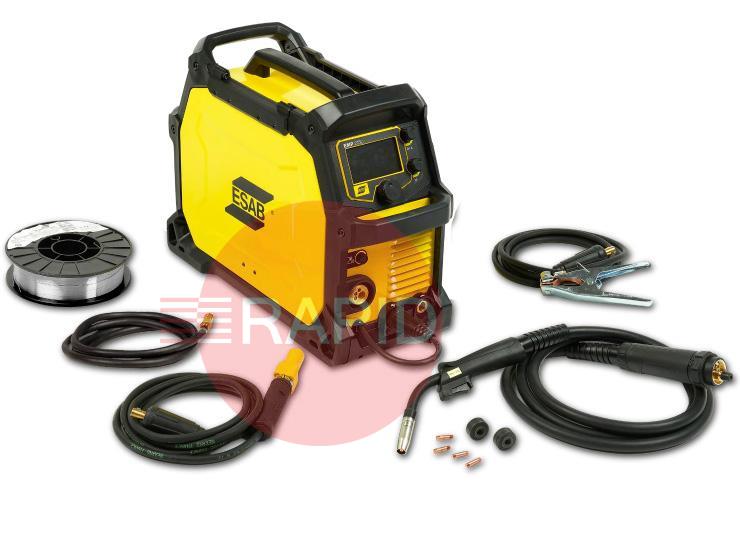 ESAB MXL 200 MIG torch with euro connector, electrode and return cable kits, 200mm spool OK Aristorod 12.50 0.8mm wire, 4.5m gas hose with quick connector, contact tips and drive rolls for 0.6 –1mm wire.