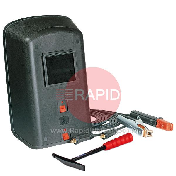 Welding place equipment complete with hand shield, slag hammer, electrode and ground cable.