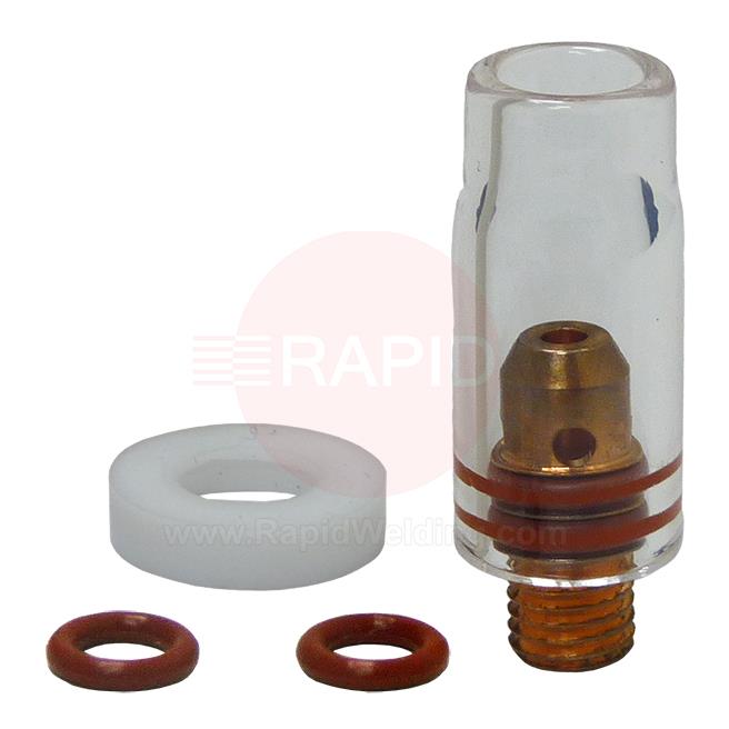 Includes one Pyrex cup mounted on a collet body with 2.4mm diameter measurement, a heatshield and two spare O-rings.