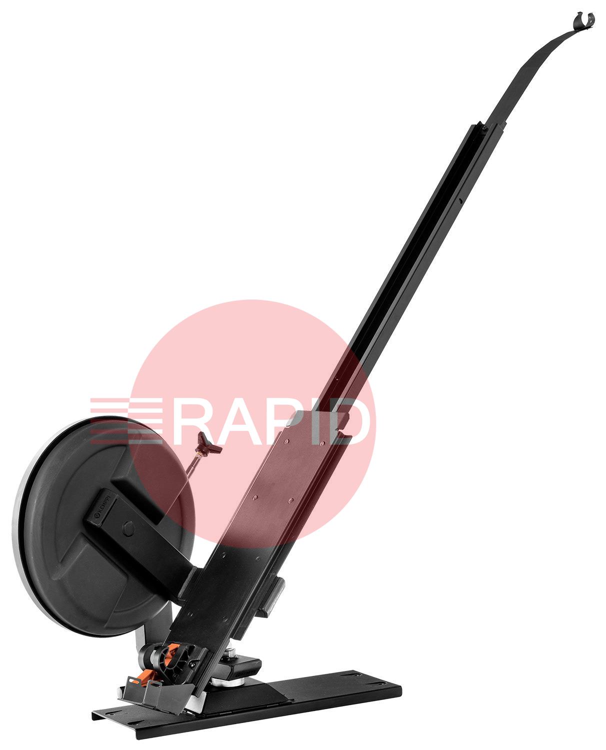 Counterbalance arm with stepless counterbalance adjustment and large adjustable working area. Contains a wider front wheel bar for the cart.