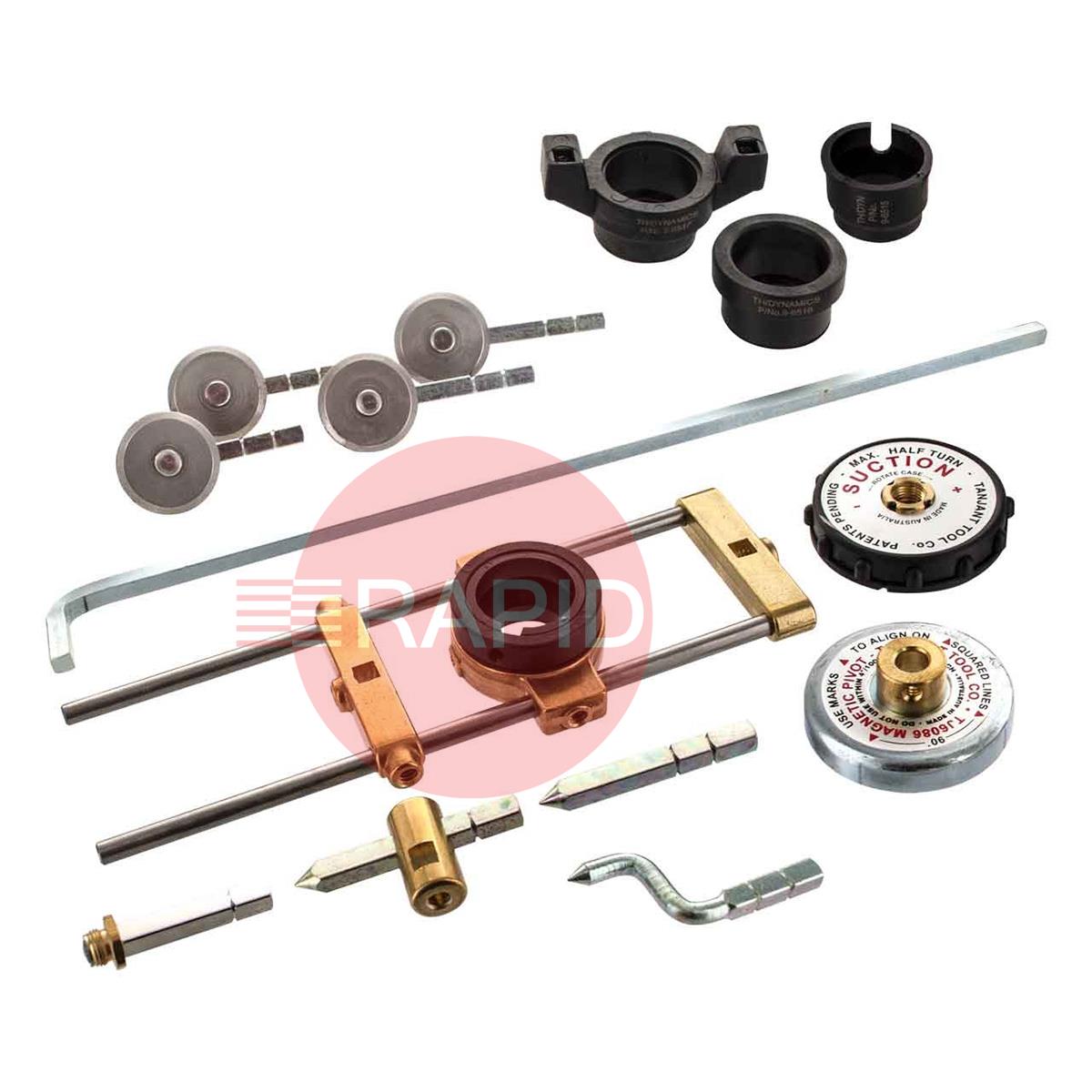 This kit includes easy add-on attachments to fit most Thermal Dynamics torches for precise straight line, circle cutting and bevelling. Includes Carrying Case, Radius/Roller Kit (7-7501), Circle Cutting Guide Kit (7-3291), Magnetic Pivot, Suction Pivot.