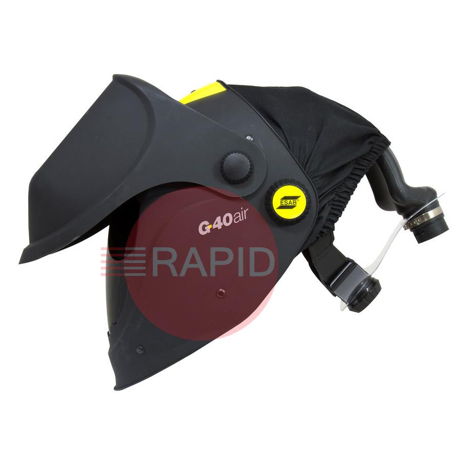 ESAB G40 is a combined welding and grinding helmet of which the G40 houses a passive shade 10 glass lens with a flip-up visor. When the visor is flipped up, the large plastic lens gives the welder an unobstructed field of view. The helmets are rated B in the impact resistance classification, which means they are approved for grinding. This product is specially made to be used with ESAB PAPR systems. This helmet includes an air duct and face seal.