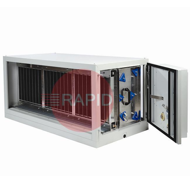 Wall or ceiling mounted filter unit with electrostatic filter, consisting of a separate ionisation and collector section. Includes 3x FIS and 3x FCS Filters. Depending on the specific application, pre and final filters have to be selected and ordered separately. The unit can be installed in an extraction duct or used in a source extraction system with arms and fan(s). No fan included.