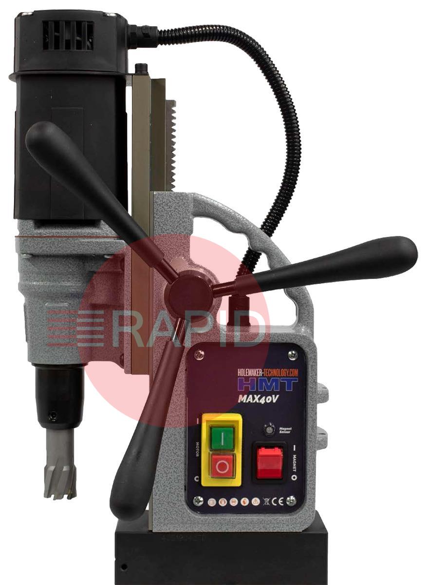The HMT MAX40V is the ultimate machine designed specifically for lightweight but powerful magnet drilling, broaching and countersinking applications. Built as the upgraded version of the MAX40, the MAX40V provides a 145mm stroke which is almost 50% more than its predecessor. With this increased range the MAX40V comfortably accommodates cutters up to 110mm for deep broaching or the VersaDrive Rapid-Lock Weldon Adapter with VersaDrive tooling, opening up 1,000s of time-saving solutions from the whole VersaDrive system. This huge increase in versatility and functionality comes in a machine that is 10% lighter than the MAX40, at just 10.5Kg and boasts almost double the magnet strength at 1500Kg. The MAX40V also sees an increase in power with its 1150w motor and offers countersinking up to 25mm, with the ability to take a chuck for added flexibility of use.