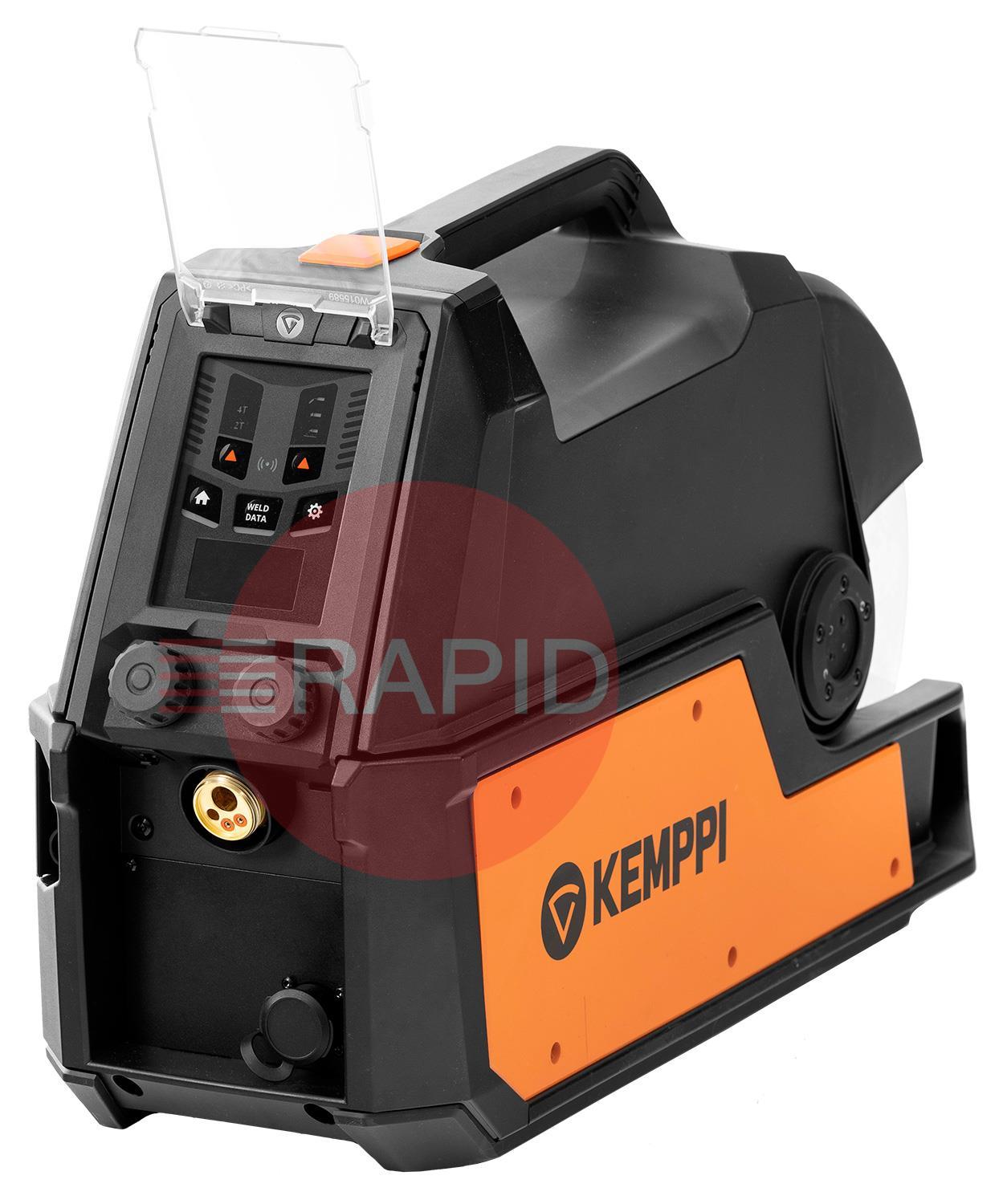 Top-loading wire feeder with a manual, 2-knob control panel and small display. For MIG, MMA, and gouging. Sturdy, 4-wheel wire feed mechanism with a kinetic spool brake and integrated light. USB port connectivity.
