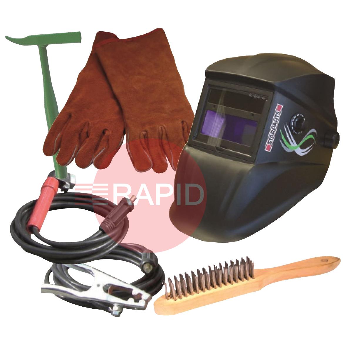 This site-ready package includes the MOSA TS 200 DES/CF machine, a wheel kit, a welding lead set, a light reactive welding helmet, welding gauntlets, a chipping hammer and a wire brush.