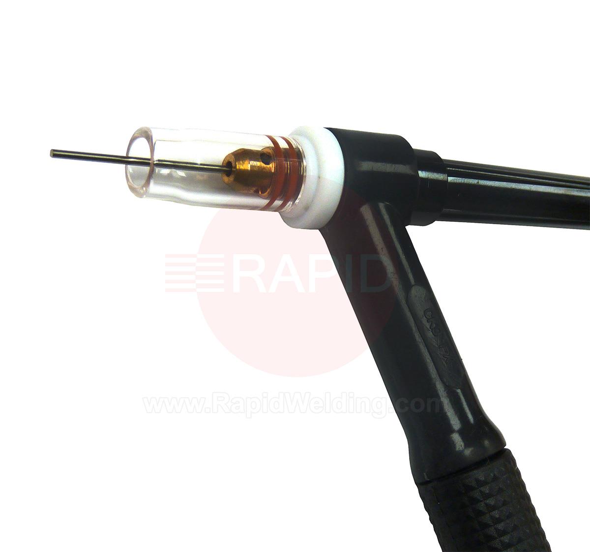 This kit is designed for 9 and 20 size TIG torches. The Ally No.5 brand of Pyrex cups is of AC/DC polarity and has an amperage rating of 200.