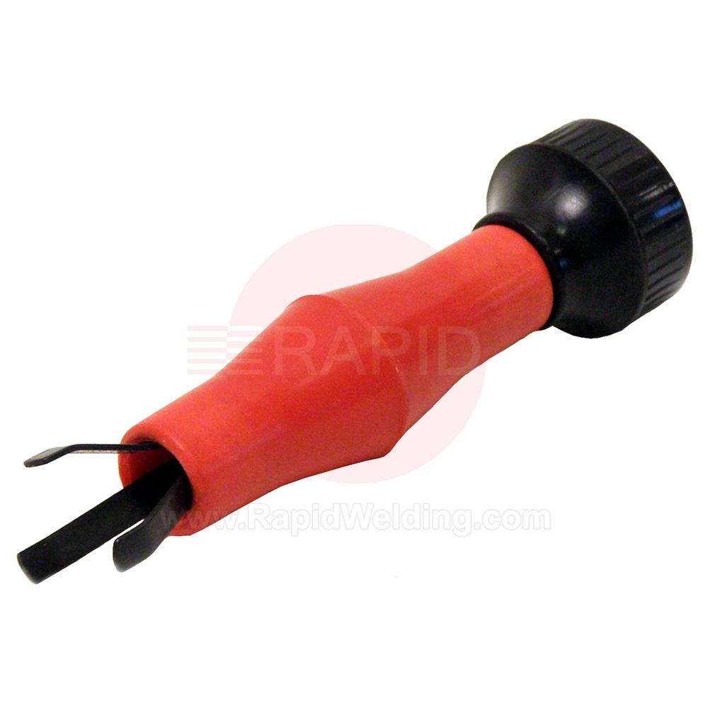 Insert the reamer into a MIG torch shroud and expand the teeth to grip the shroud from the inside. By rotating with teeth expanded, spatter is removed from the inside of shroud and from around tip to allow the shielding gas to flow more easily.