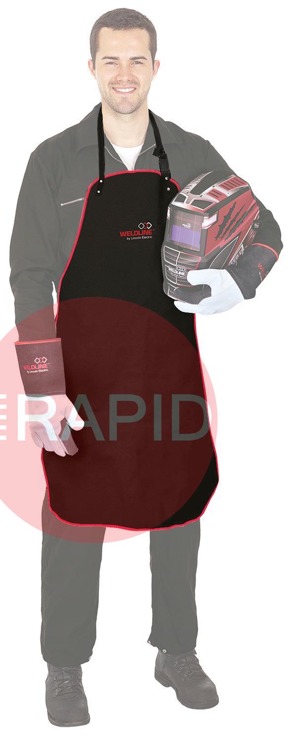 The Weldline Split Leather Apron is designed to protect the clothes of the welder from welding spatters and grinding particles. This apron is fixed with a leather strap which releases clips to the waist and flap, with leather laces, fastening with rapid connection, sewn finish with a red fabric border and is a single size only. Dimensions 1100 x 800mm.