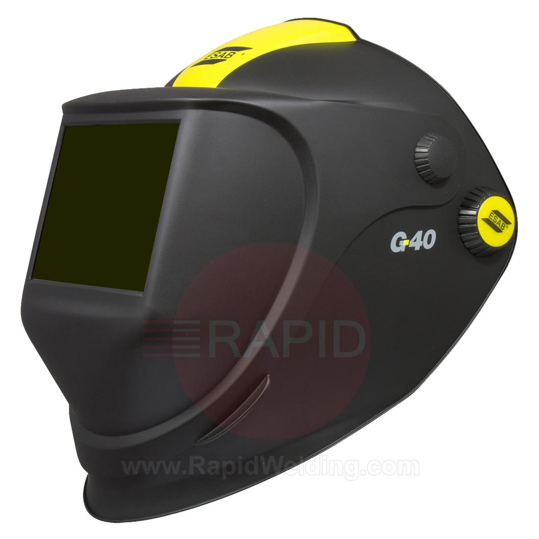 ESAB G40 is a combined welding and grinding helmet of which the G40 houses a passive shade 10 glass lens with a flip-up visor. When the visor is flipped up, the large plastic lens gives the welder an unobstructed field of view. The helmets are rated B in the impact resistance classification, which means they are approved for grinding. This product is specially made to be used with ESAB PAPR systems. This helmet includes an air duct and face seal.