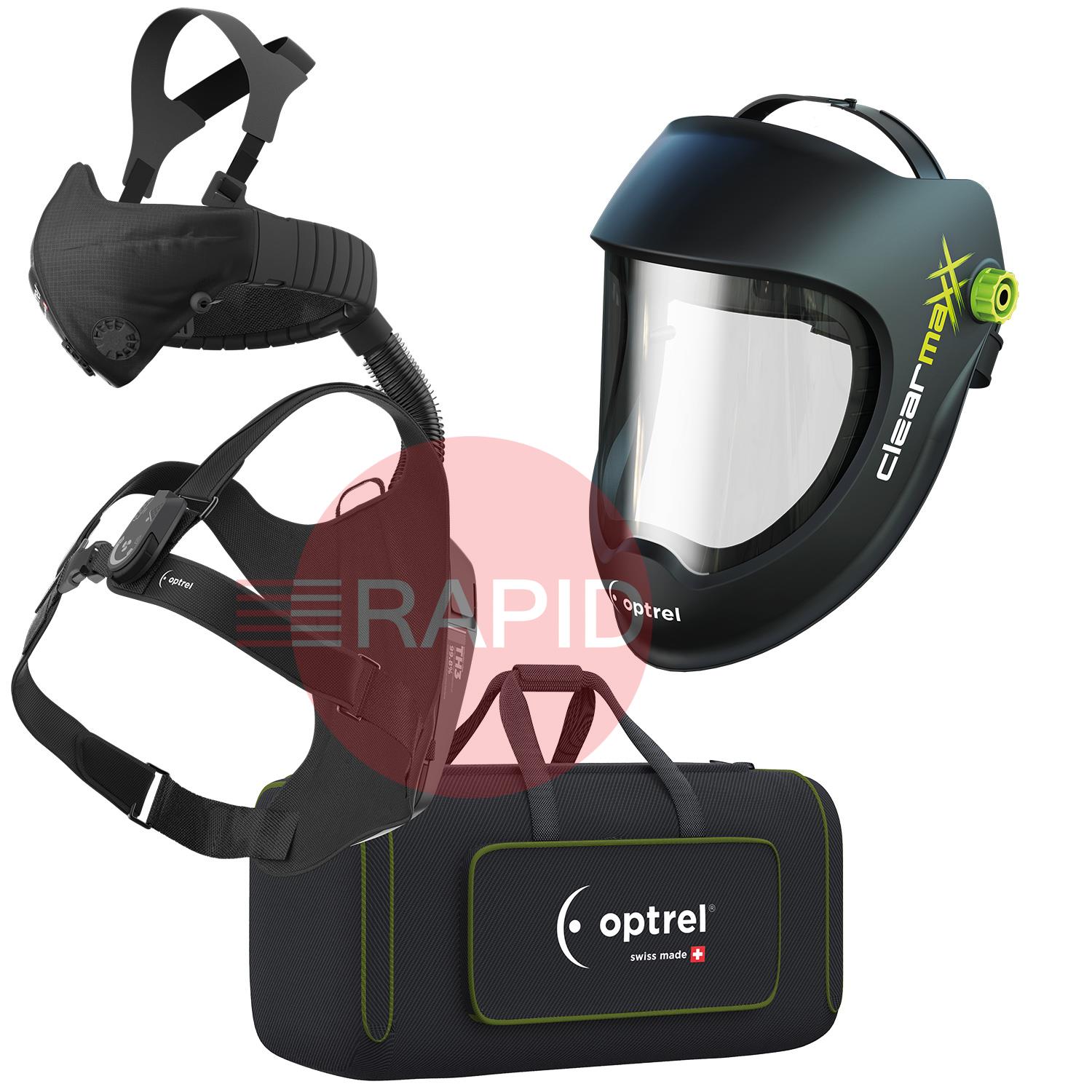 This ready-to-grind package includes the Clearmaxx helmet, and the Swiss Air respiratory protection system complete with a control panel with a comfort half mask: consisting of a half mask and hose system. Also included is a head and neck strap, blower unit, 14-hour battery, battery charger (UK, EU, US and AUS adaptors), shoulder harness and storage bag.