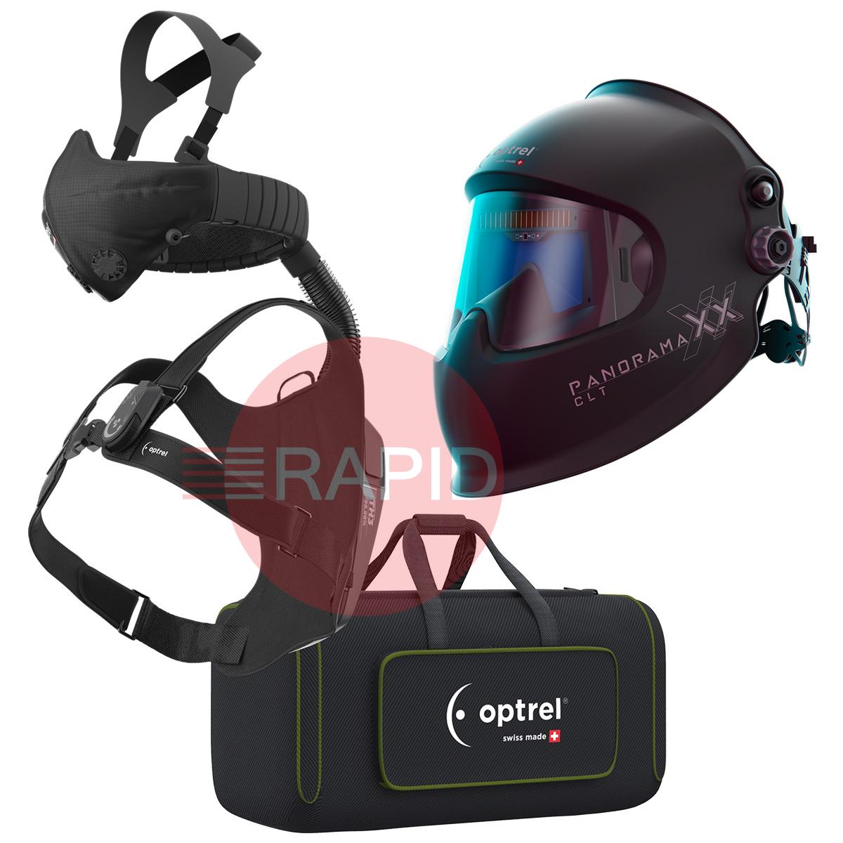 This ready to grind package includes the Panoramaxx CLT Black helmet, the Swiss Air respiratory protection system complete with control panel with comfort half mask: consisting of half mask and hose system. Also included is a head and neck strap, blower unit, 14-hour battery, battery charger (UK, EU, US and AUS adaptors), shoulder harness and storage bag.
