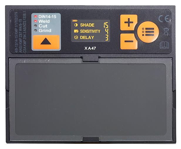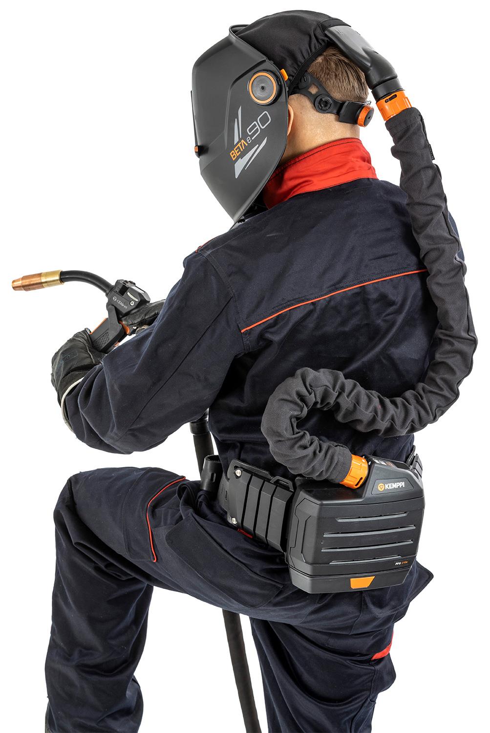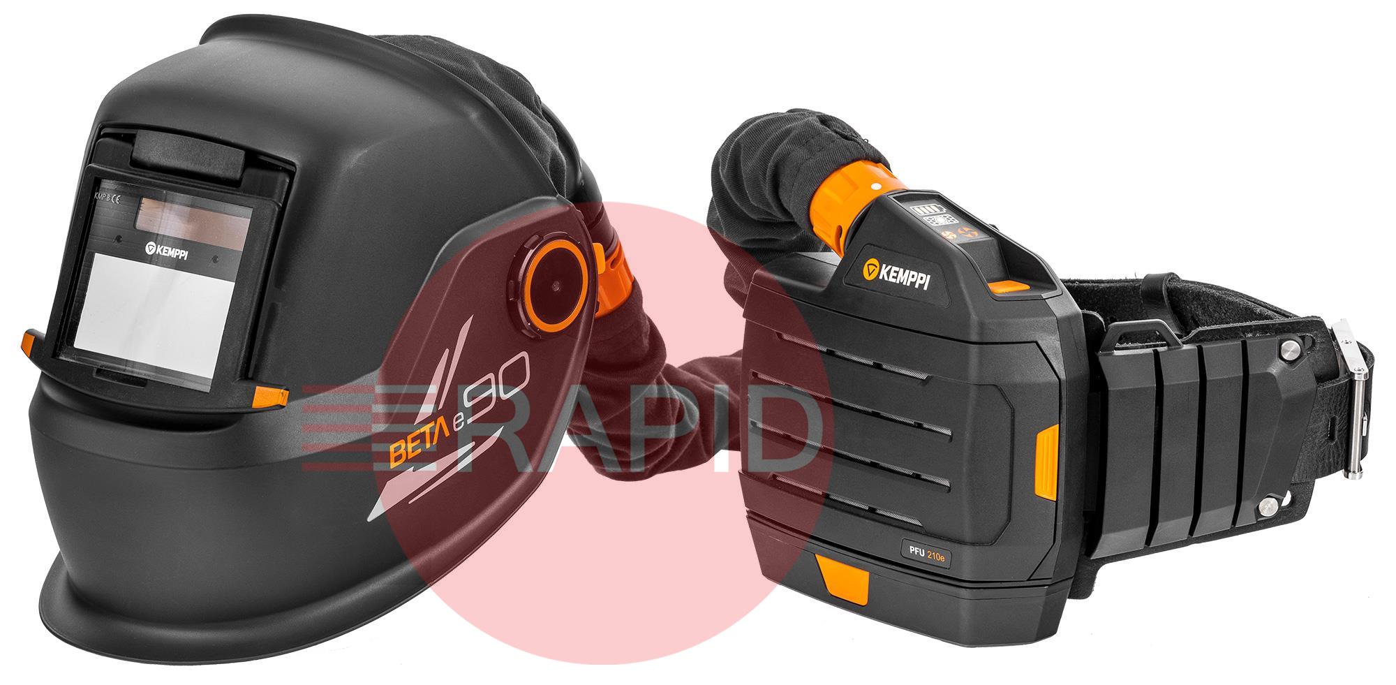 This Kemppi ready-to-weld package includes the BETA E90 welding helmet with an auto-darkening XA 47 welding filter with a shade range of 9-15. This package also includes the PFU 210e powered air-purifying respirator system.