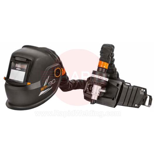 This Kemppi ready-to-weld package includes the BETA E90 welding helmet with an auto-darkening XA 47 welding filter with a shade range of 9-15. This package also includes the RSA 230 supplied air regulator system.