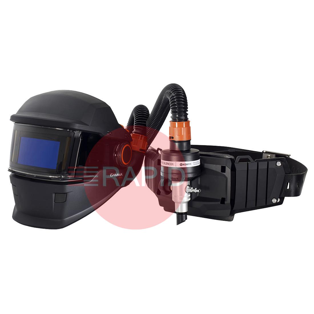 This Kemppi ready-to-weld package includes the GAMMA GTH3 welding helmet with an auto-darkening SA 47 welding filter and a shade range of 5, 8, 9-13. This package also includes the RSA 230 supplied air regulator system.
