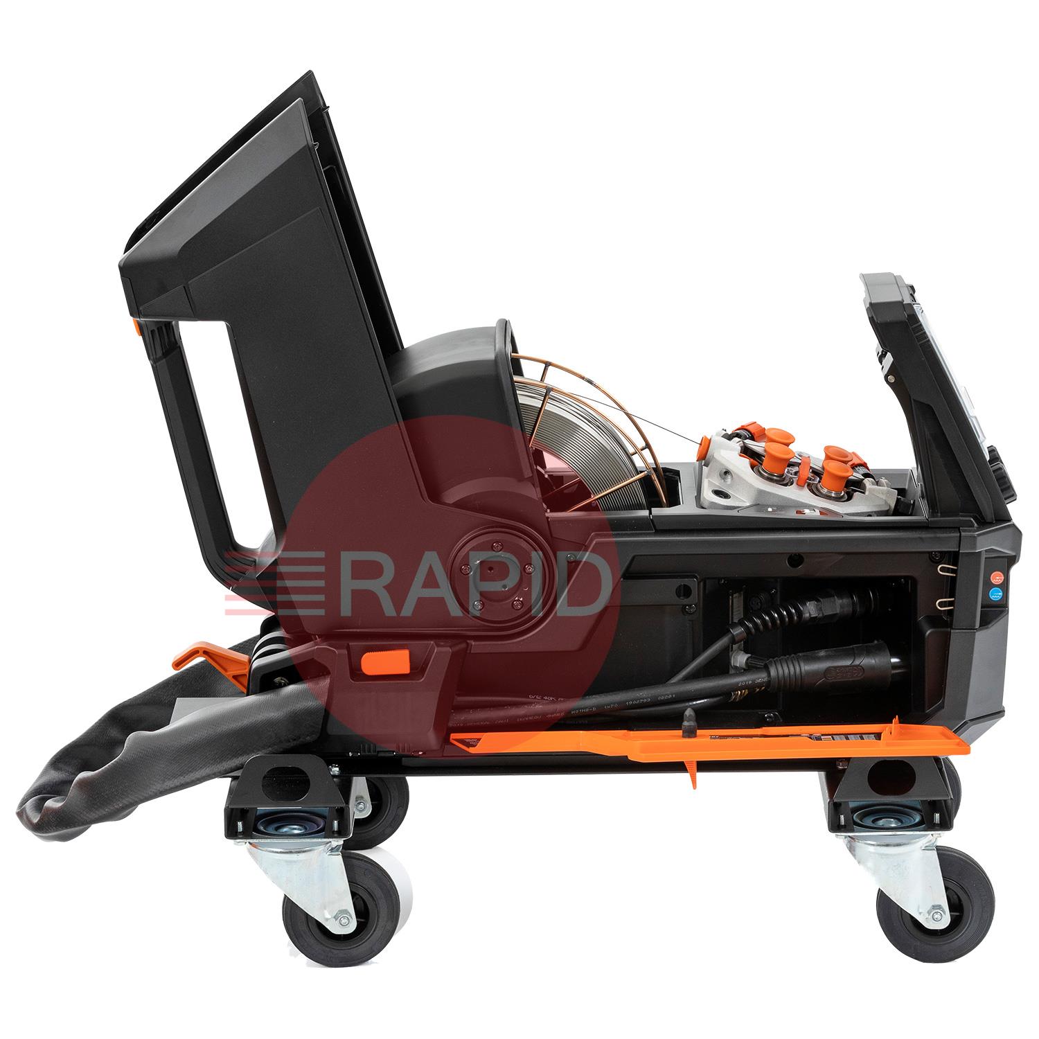 Top-loading wire feeder with a graphical, 5.7" TFT display panel. For synergic and pulse MIG /MAG, TIG, stick (MMA), and gouging. Automatic parameter adjustment with Weld Assist. 4-wheel wire feed mechanism with integrated lighting and a kinetic spool brake, rotameter included as standard. USB port and Bluetooth connectivity. Enables the use of MAX welding processes, Wise welding processes, and SuperSnake GTX sub feeder.