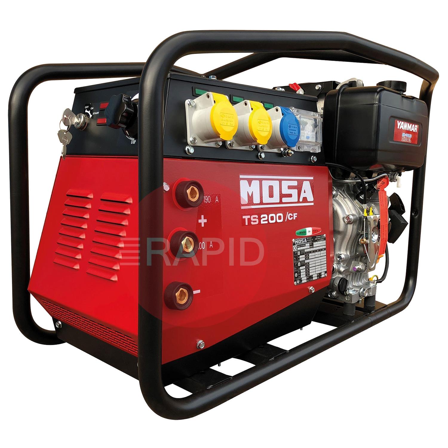 This site-ready package includes the MOSA TS 200 DES/CF machine, a wheel kit, a welding lead set, a light reactive welding helmet, welding gauntlets, a chipping hammer and a wire brush.